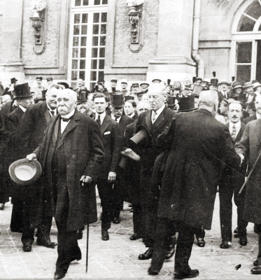 Le président du conseil Georges Clémenceau et le président américain Woodrow Wilson quittent le château de Versailles après la signature du traité de paix le 28 juin 1919.