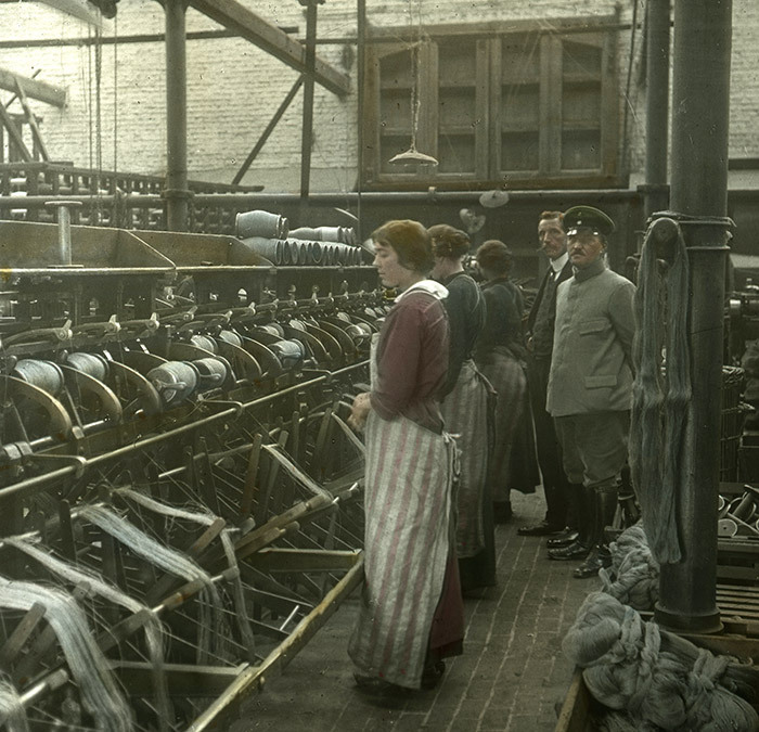 La production industrielle au service de la puissance d’occupation : un soldat allemand à côté d’ouvrières d’une usine textile à Menin en Belgique
